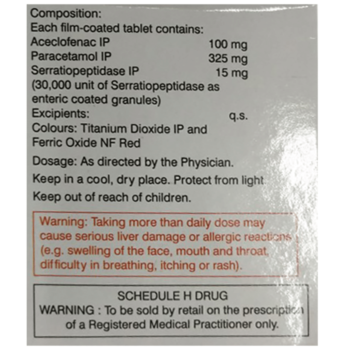 Q. What is Aceclo Sera 100mg/325mg/15mg Tablet?::: It is a combination of three medicines: Aceclofenac, Paracetamol, and Serratiopeptidase. This medication helps in relieving pain and inflammation. It works by lowering the levels of chemical substances in the body that cause pain and inflammation.| Q. Is it safe to take Aceclo Sera 100mg/325mg/15mg Tablet?::: It is safe to take this medicine for most of the patients. However, in some patients, it may cause unwanted side effects like nausea, vomiting, stomach pain, heartburn, and diarrhea. If you experience any persistent problem due to the medication, inform your doctor as soon as possible.| Q. Can I stop taking Aceclo Sera 100mg/325mg/15mg Tablet when my pain is relieved?::: This medicine is usually used for the short term and can be discontinued when your pain is relieved. However, continued taking it if your doctor has advised you to do so.| Q. Can Aceclo Sera 100mg/325mg/15mg Tablet cause nausea and vomiting?::: Yes, the use of this medicine can cause nausea and vomiting. In case you experience nausea while taking this medicine, take it with milk, food, or with antacids. Avoid taking fatty or fried foods along with this medication. In case of vomiting, drink plenty of water or other fluids by taking small frequent sips. Talk to your doctor if vomiting persists and you notice signs of dehydration, like dark colored and strong-smelling urine and a low frequency of urination. Do not take any other medicines without speaking to your doctor.| Q. Can Aceclo Sera 100mg/325mg/15mg Tablet cause dizziness?::: Yes, the use of this medicine can cause dizziness (feeling faint, weak, unsteady or lightheaded) in some patients. If you feel dizzy or lightheaded, it is better to rest for sometime and resume once you feel better.| Q. Are there any specific contraindications associated with taking Aceclo Sera 100mg/325mg/15mg Tablet?::: The use of this medicine is considered harmful for patients with known allergy to any of the components or excipients of this medicine or in patients with known allergy to other painkillers (NSAIDs). Its use should preferably be avoided in patients with a history of stomach ulcers or in patients with active, recurrent stomach ulcers/bleeding. It should also be avoided in patients with a history of heart failure, high blood pressure, and liver or kidney disease.| Q. Can I take Aceclo Sera 100mg/325mg/15mg Tablet with vitamin B-complex?::: Yes, this medicine can be taken with vitamin B-complex preparations. While it helps to relieve pain, vitamin B-complex can help to correct the vitamin deficiency that might be causing your symptoms.| Q. Can the use of Aceclo Sera 100mg/325mg/15mg Tablet cause damage to kidneys?::: Yes, long-term use of this medicine can cause damage to the kidneys. Normal kidneys produce a chemical called prostaglandins that protect them from damage. The use of painkillers lowers the levels of prostaglandins in the body, which leads to kidney damage on long-term use. The use of painkillers is not recommended in patients with underlying kidney disease.| Q. Can I take a higher dose of Aceclo Sera 100mg/325mg/15mg Tablet than recommended?::: No, taking a higher than recommended dose can lead to increased chances of side effects. If you are experiencing increased severity of pain or the pain is not relieved by the recommended doses, please consult your doctor for re-evaluation.| Q. What are the instructions for storage and disposal of Aceclo Sera 100mg/325mg/15mg Tablet?::: Keep this medicine in the packet or the container it came in, tightly closed. Store it according to the instructions mentioned on the pack or label. Dispose of the unused medicine. Make sure it is not consumed by pets, children and other people.