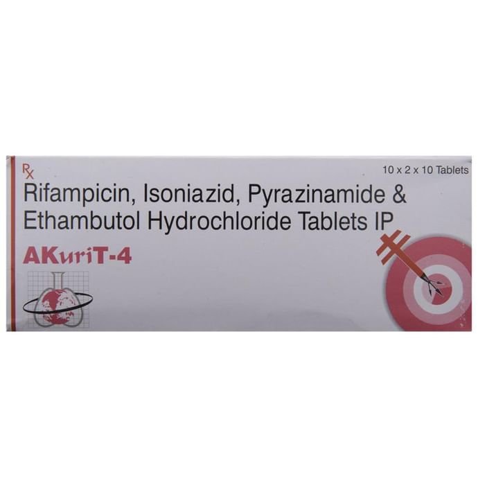 Akurit 4 Tablet is a combination medicine used in the treatment of tuberculosis. It prevents the growth of the microorganisms that cause the infection. Akurit 4 Tablet is a prescription medicine and it is to be taken it as suggested by the doctor. It should be taken in an empty stomach and take it at a fixed time to ensure better efficacy. Do not consume more than the recommended dose, as this may have harmful effects on your body. If you miss a dose, take it as soon as you remember. The course of the treatment must be completed even if you feel better. Sudden discontinuation of the treatment may affect the potency of the medicine. The medicine may take some to show its effects on the symptoms. However, it is advised to consult the doctor if you feel an aggravation of the condition or if your condition does not improve. Some common side effects of this medicine are nausea, vomiting, fever, dark-colored urine, sweating, increased saliva, etc. To cope up with the side effects, you should drink plenty of water. If any of the side effects get aggravated, you must consult your doctor immediately. Generally, serious side effects are rare. If you experience any allergic reaction (rashes, itching, swelling, shortness of breath, etc.), you must seek immediate medical help. Before taking this medicine, you should tell your doctor if you are taking any medicines for any health condition. Patients with liver and kidney ailments must take this medicine with proper consultation and caution. Pregnant or breastfeeding women should also consult with the doctor before taking it. Avoid drinking alcohol as it can cause excessive drowsiness with this medicine. It usually does not impair your ability to drive, but you should not drive if it makes you feel sleepy or dizzy. During the treatment, you must take adequate rest and eat a healthy diet for a faster recovery. While on the medication, your doctor may ask for a few laboratory and diagnostic tests to know the effects of the medicine on your body.