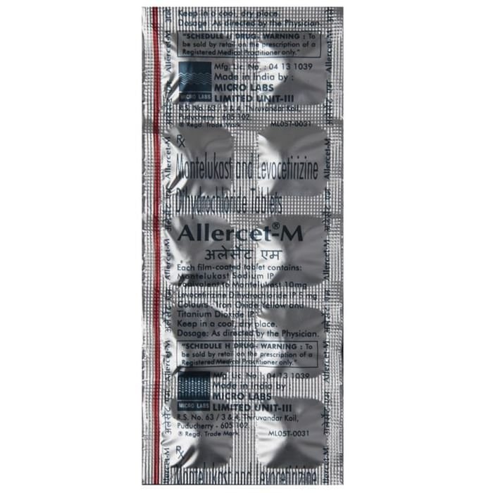 Q. What is Allercet-M Tablet?::: Allercet-M Tablet is a combination of two medicines: Montelukast and Levocetirizine. Levocetirizine is an antiallergic which helps to relieve allergy symptoms like runny nose, sneezing, watery eyes and cough. It works by lowering chemicals in the body that cause allergy symptoms. Montelukast works by blocking another chemical messenger (leukotriene) and reduces inflammation (swelling) in the airways and nose. This further helps to relieve the symptoms.| Q. Can the use of Allercet-M Tablet cause drowsiness or sleepiness?::: Yes, the most common side effect of Allercet-M Tablet is sleepiness. Do not drive, operate heavy machinery or engage in other activities that need your full attention unless your doctor says that you may do so. Do not drink alcohol or take other central nervous system depressants, such as cough and cold medicines. Also avoid taking certain pain relief medicines and medicines that help you sleep as they can lead to severe drowsiness or can worsen it, causing falls or accidents.| Q. Can Allercet-M Tablet be stopped when allergy symptoms are relieved?::: No, Allercet-M Tablet should be continued as advised by the doctor. If you experience any side effects of this medicine or the symptoms of allergy are worsened, consult the doctor for re-evaluation.| Q. Can the use of Allercet-M Tablet cause dry mouth?::: Yes, the use of Allercet-M Tablet can cause dry mouth. If you experience dry mouth, drink plenty of water. Take regular sips during the day and keep some water by your bed at night. You may use lip balm if your lips are also dry.| Q. Can I drink alcohol while taking Allercet-M Tablet?::: No, do not take alcohol while taking Allercet-M Tablet. Drinking alcohol will increase the severity of drowsiness/sleepiness caused by Allercet-M Tablet.| Q. Will Allercet-M Tablet be more effective if taken in higher doses?::: No, taking a higher dose of this medicine than recommended will not make it more effective. Consuming higher than the recommended dose of Allercet-M Tablet can cause increased side effects. If the symptoms are getting severe, please consult the doctor for re-evaluation.| Q. What are the instructions for storage and disposal of Allercet-M Tablet?::: Keep this medicine in the container or the pack it came in, tightly closed. Store it according to the instructions mentioned on the pack or label. Dispose of the unused medicine. Make sure it is not consumed by pets, children, and other people.