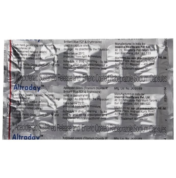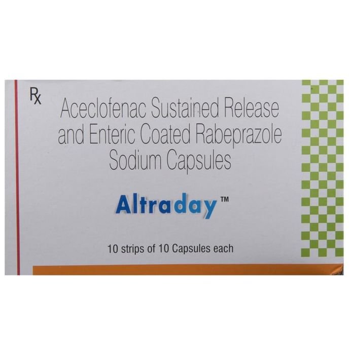 Altraday Capsule SR is a combination of two medicines: Aceclofenac and Rabeprazole, which relieves pain. Aceclofenac is a non-steroidal anti-inflammatory drug (NSAID) which works by blocking the release of certain chemical messengers that cause pain and inflammation (redness and swelling). Rabeprazole is a proton-pump inhibitor which prevents damage to the stomach lining caused by Aceclofenac.