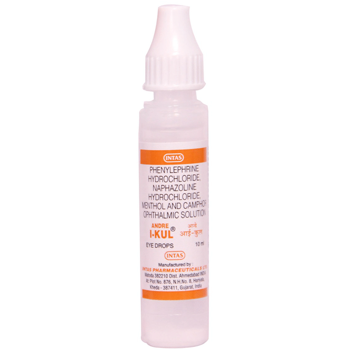 Andre I-Kul Eye Drop is a combination of four medicines: Camphor, Menthol, Naphazoline and Phenylephrine, which treats allergic eye disease. Camphor and Menthol provide a cooling effect to the eye. Naphazoline and Phenylephrine are decongestants which work by narrowing blood vessels of the eye to relieve inflammation (redness and swelling).