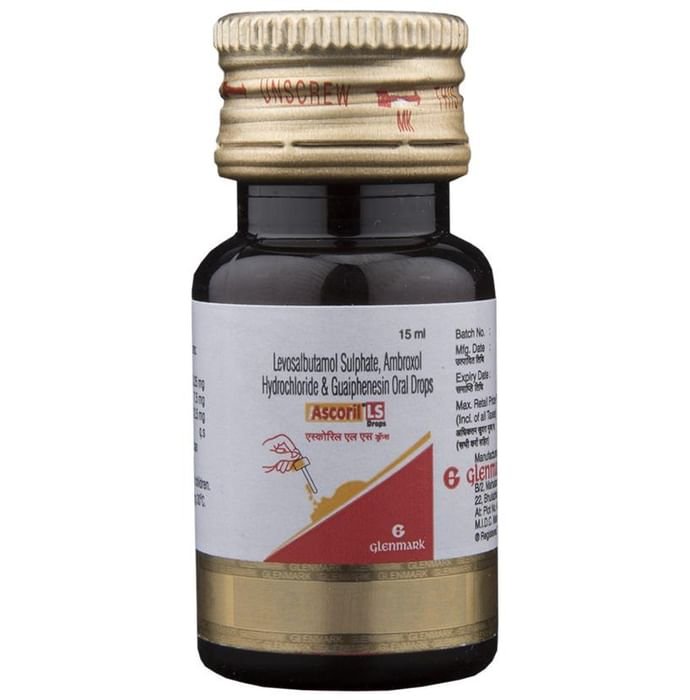 Ascoril LS Drops is a combination of three medicines: Ambroxol, Levosalbutamol, and Guaifenesin, which relieves cough with mucus. Ambroxol is a mucolytic that thins and loosens mucus (phlegm), making it easier to cough out. Levosalbutamol is a bronchodilator. It works by relaxing the muscles in the airways and widens the airways. Guaifenesin is an expectorant that decreases the stickiness of mucus (phlegm) and helps in its removal from the airways. Together, they make breathing easier.