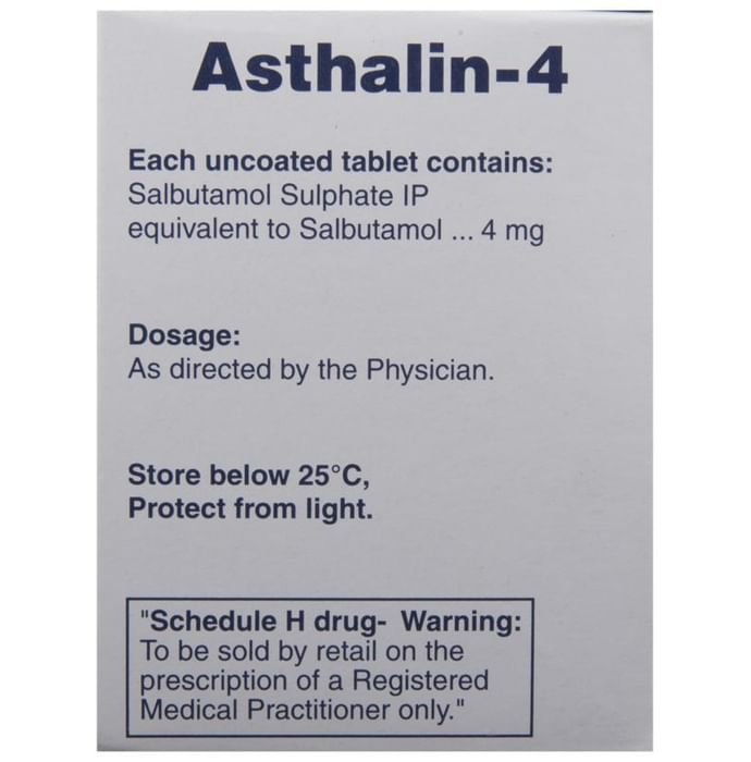 Q. What would happen if I take higher than the recommended dose of Asthalin 4 Tablet?::: Taking a higher than the recommended dose of Asthalin 4 Tablet may cause seizures, chest pain, nervousness, headache, dry mouth, nausea, dizziness and lack of energy. High doses of Asthalin 4 Tablet may also cause fast, irregular or pounding heartbeat, uncontrollable shaking of any part of the body, and difficulty falling asleep or staying asleep. In any such case, seek immediate medical attention.| Q. Is it safe to take Asthalin 4 Tablet if I have heart disease?::: Yes, Asthalin 4 Tablet is considered safe, but its use depends on the severity of your heart problem. If you experience chest pain or any other symptom of worsening heart disease while taking Asthalin 4 Tablet, seek immediate medical advice.| Q. Being a diabetic, what should I remember while taking Asthalin 4 Tablet?::: Asthalin 4 Tablet may cause blood sugar levels to rise. Therefore, your doctor may adjust your dose of insulin or antidiabetic medicines. Keep a regular check on your blood glucose levels and do not miss any appointments. Consult your doctor if you experience a sudden rise in blood sugar levels.| Q. I have started using Asthalin 4 Tablet and I am experiencing headaches and shakiness. Is this because of Asthalin 4 Tablet and will these go away?::: Yes, it could be due to Asthalin 4 Tablet. Feeling shaky is a common side effect of Asthalin 4 Tablet which goes away after some time. For headaches, drink plenty of water, get sufficient rest and avoid alcohol. Usually headaches go away after a week. If they persist for a long time, contact your doctor.| Q. When should I take Asthalin 4 Tablet?::: Use Asthalin 4 Tablet as and when you need it. Asthalin 4 Tablet relieves the symptoms of asthma like coughing, shortness of breath and tightness in the chest. You can also take it to prevent asthma attacks in circumstances where you know it may occur (e.g., after strenuous exercise or unavoidable exposure to allergen).| Q. Can I smoke if I have been prescribed Asthalin 4 Tablet?::: No, you should not smoke while taking Asthalin 4 Tablet. Smoking irritates the lungs. The medicine may make breathing more difficult, especially in patients who have asthma. Take advice from your doctor if you are finding it hard to avoid smoking.