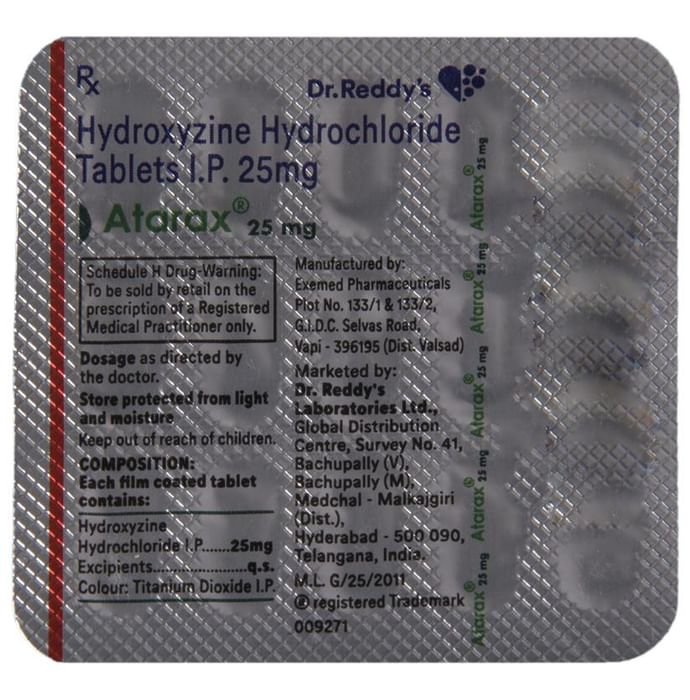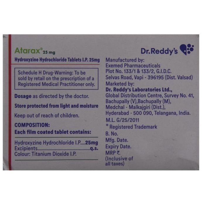 Atarax 25mg Tablet is used to treat anxiety and helps to get relaxed before or after surgery. It is also used to treat symptoms of skin allergy like itching, swelling, and rashes in conditions such as eczema, dermatitis, and psoriasis. Atarax 25mg Tablet should be taken with or without food. Take it exactly as your doctor has prescribed. The dose and how often you take it depends on what you are taking it for. Your doctor will decide how much you need to improve your symptoms. Take it for as long as it is prescribed for you. In case, you have missed any doses, take the next dose as soon as you remember it. However, you should never take a double dose. The most common side effects of this medicine include sedation, nausea, vomiting, stomach upset, and constipation. If these bother you or appear serious, let your doctor know. There may be ways of reducing or preventing them. You must avoid driving or attention-seeking activity while on treatment. Before taking this medicine, let your doctor know if you have heart problems or have high blood pressure, have liver or kidney problems. Inform your doctor if you are pregnant, or breastfeeding. Your doctor should also know about all other medicines you are taking as many of these may make this medicine less effective or change the way it works. Generally, it is advised to avoid alcohol while on treatment.
