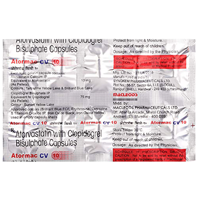 In Heart attack prevention and high cholesterol Atormac CV10 Capsule is a combination medicine that is used to prevent heart attack. It contains Atorvastatin that works by reducing the amount of ?bad? cholesterol (LDL) and raising the amount of ?good? cholesterol (HDL) in your blood. High levels of cholesterol can cause your blood vessels to narrow (atherosclerosis). Lowering the amount of cholesterol reduces the chances of heart diseases and helps you remain healthier for longer. Besides, it also contains a blood thinner, Clopidogrel, that prevents the formation of blood clots and also prevents the existing ones from growing bigger in size. Take it regularly and make appropriate lifestyle changes (such as eating healthy and staying active) to maximize the effectiveness of this medicine. Keep taking it even if you feel well.