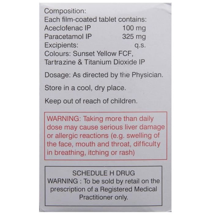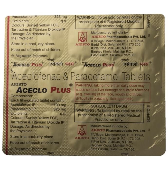 Q. What is Aceclo Plus Tablet?::: Aceclo Plus Tablet is a combination of two medicines: Aceclofenac and Paracetamol. This medication helps in relieving pain and inflammation. It works by lowering the levels of chemical substances in the body that cause pain and inflammation.| Q. Is it safe to use Aceclo Plus Tablet?::: Aceclo Plus Tablet is safe for most of the patients. However, in some patients it may cause some unwanted common side effects like nausea, vomiting, stomach pain, heartburn, diarrhea and other uncommon and rare side effects.| Q. Can I stop taking Aceclo Plus Tablet when my pain is relieved?::: If you are using the medication for a condition associated with long-term pain then Aceclo Plus Tablet should be continued for as long as advised by your physician. It can be discontinued if you are using it for short-term pain relief.| Q. Can the use of Aceclo Plus Tablet cause nausea and vomiting?::: Yes, the use of Aceclo Plus Tablet can cause nausea and vomiting. Taking it with milk, food or with antacids can prevent nausea. Avoid taking fatty or fried foods along with this medication. In case of vomiting drink plenty of water or other fluids by taking small frequent sips. Talk to your doctor if vomiting persists and you notice signs of dehydration, like dark colored and strong-smelling urine and a low frequency of urination. Do not take any other medicine without speaking to your doctor.| Q. Can the use of Aceclo Plus Tablet cause dizziness?::: Yes, the use of Aceclo Plus Tablet can cause dizziness (feeling faint, weak, unsteady or lightheaded) in some patients. If you feel dizzy or lightheaded, it is better to rest for sometime and resume once you feel better.| Q. Are there any specific contraindications associated with the use of Aceclo Plus Tablet?::: The use of Aceclo Plus Tablet is considered to be harmful for patients with known allergy to any of the components or excipients of this medicine or in patients with known allergy to other painkillers (NSAIDs). It should preferably be avoided in patients with a history of stomach ulcers or in patients with active, recurrent stomach ulcer/bleeding. It should also be avoided in patients with a history of heart failure, high blood pressure, and liver or kidney disease.| Q. Can Aceclo Plus Tablet be taken with vitamin B-complex?::: Yes, Aceclo Plus Tablet can be taken with vitamin B-complex preparations. While Aceclo Plus Tablet helps to relieve pain, vitamin B-complex can help to correct the vitamin deficiency that might be causing the underlying painful condition.| Q. Is Aceclo Plus Tablet helpful in relieving stomach pain?::: No, Aceclo Plus Tablet preferably should not be taken for stomach pain without consulting a physician. This drug can increase stomach acid secretion which may aggravate an unknown underlying condition.| Q. Can the use of Aceclo Plus Tablet cause damage to kidneys?::: Yes, the long-term use of Aceclo Plus Tablet can cause damage to the kidneys. Normal kidneys produce a chemical messenger called prostaglandins that protects them from damage. Use of painkillers lowers the levels of prostaglandins in the body which leads to kidney damage on long-term use. Use of painkillers is not recommended to patients with underlying kidney disease.| Q. Is it safe to take a higher dose of Aceclo Plus Tablet than recommended?::: No, taking higher than the recommended dose of Aceclo Plus Tablet can lead to increased chances of side effects like nausea, vomiting, heartburn, indigestion, diarrhea and can also damage your kidneys on long-term use. If you are experiencing increased severity of pain or if the pain is not relieved by the recommended doses of this medicine, please consult your doctor for re-evaluation.| Q. What are the instructions for storage and disposal of Aceclo Plus Tablet?::: Keep this medicine in the container or the pack it came in, tightly closed. Store it according to the instructions mentioned on the pack or label. Dispose of the unused medicine. Make sure it is not consumed by pets, children and other people.