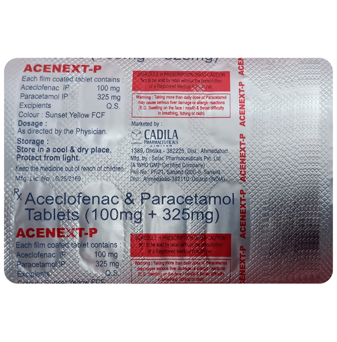 Q. What is Acenext P 100mg/325mg Tablet?::: Acenext P 100mg/325mg Tablet is a combination of two medicines: Aceclofenac and Paracetamol. This medication helps in relieving pain and inflammation. It works by lowering the levels of chemical substances in the body that cause pain and inflammation.| Q. Is it safe to use Acenext P 100mg/325mg Tablet?::: Acenext P 100mg/325mg Tablet is safe for most of the patients. However, in some patients it may cause some unwanted common side effects like nausea, vomiting, stomach pain, heartburn, diarrhea and other uncommon and rare side effects.| Q. Can I stop taking Acenext P 100mg/325mg Tablet when my pain is relieved?::: If you are using the medication for a condition associated with long-term pain then Acenext P 100mg/325mg Tablet should be continued for as long as advised by your physician. It can be discontinued if you are using it for short-term pain relief.| Q. Can the use of Acenext P 100mg/325mg Tablet cause nausea and vomiting?::: Yes, the use of Acenext P 100mg/325mg Tablet can cause nausea and vomiting. Taking it with milk, food or with antacids can prevent nausea. Avoid taking fatty or fried foods along with this medication. In case of vomiting drink plenty of water or other fluids by taking small frequent sips. Talk to your doctor if vomiting persists and you notice signs of dehydration, like dark colored and strong-smelling urine and a low frequency of urination. Do not take any other medicine without speaking to your doctor.| Q. Can the use of Acenext P 100mg/325mg Tablet cause dizziness?::: Yes, the use of Acenext P 100mg/325mg Tablet can cause dizziness (feeling faint, weak, unsteady or lightheaded) in some patients. If you feel dizzy or lightheaded, it is better to rest for sometime and resume once you feel better.| Q. Are there any specific contraindications associated with the use of Acenext P 100mg/325mg Tablet?::: The use of Acenext P 100mg/325mg Tablet is considered to be harmful for patients with known allergy to any of the components or excipients of this medicine or in patients with known allergy to other painkillers (NSAIDs). It should preferably be avoided in patients with a history of stomach ulcers or in patients with active, recurrent stomach ulcer/bleeding. It should also be avoided in patients with a history of heart failure, high blood pressure, and liver or kidney disease.| Q. Can Acenext P 100mg/325mg Tablet be taken with vitamin B-complex?::: Yes, Acenext P 100mg/325mg Tablet can be taken with vitamin B-complex preparations. While Acenext P 100mg/325mg Tablet helps to relieve pain, vitamin B-complex can help to correct the vitamin deficiency that might be causing the underlying painful condition.| Q. Is Acenext P 100mg/325mg Tablet helpful in relieving stomach pain?::: No, Acenext P 100mg/325mg Tablet preferably should not be taken for stomach pain without consulting a physician. This drug can increase stomach acid secretion which may aggravate an unknown underlying condition.| Q. Can the use of Acenext P 100mg/325mg Tablet cause damage to kidneys?::: Yes, the long-term use of Acenext P 100mg/325mg Tablet can cause damage to the kidneys. Normal kidneys produce a chemical messenger called prostaglandins that protects them from damage. Use of painkillers lowers the levels of prostaglandins in the body which leads to kidney damage on long-term use. Use of painkillers is not recommended to patients with underlying kidney disease.| Q. Is it safe to take a higher dose of Acenext P 100mg/325mg Tablet than recommended?::: No, taking higher than the recommended dose of Acenext P 100mg/325mg Tablet can lead to increased chances of side effects like nausea, vomiting, heartburn, indigestion, diarrhea and can also damage your kidneys on long-term use. If you are experiencing increased severity of pain or if the pain is not relieved by the recommended doses of this medicine, please consult your doctor for re-evaluation.| Q. What are the instructions for storage and disposal of Acenext P 100mg/325mg Tablet?::: Keep this medicine in the container or the pack it came in, tightly closed. Store it according to the instructions mentioned on the pack or label. Dispose of the unused medicine. Make sure it is not consumed by pets, children and other people.