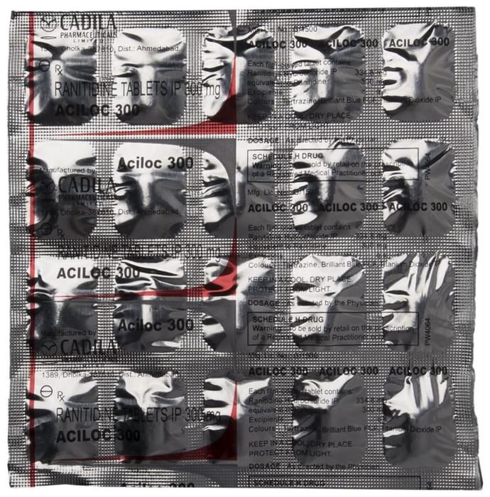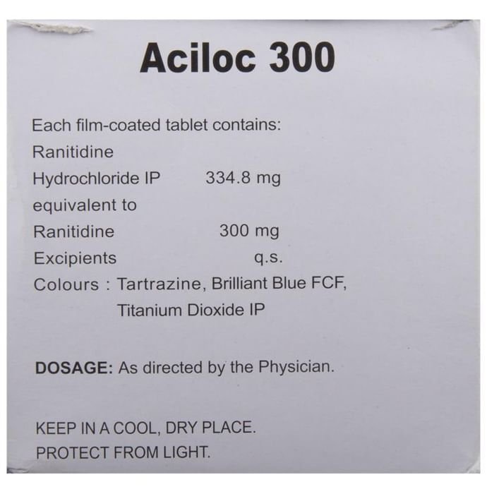 Q. Is Aciloc 300 Tablet safe for long-term use?::: There is limited data available on whether Aciloc 300 Tablet can be used for the long term or not, but it is a relatively safe medicine. You should take it for the duration advised by your doctor. Do not take over-the-counter Aciloc 300 Tablet for longer than 2 weeks unless advised by your doctor.| Q. Can I take Aciloc 300 Tablet empty stomach?::: Aciloc 300 Tablet may be taken with or without food. It can be taken once daily before bedtime or twice daily in the morning and before bedtime, as recommended.| Q. Is Aciloc 300 Tablet effective?::: Aciloc 300 Tablet would be effective only if used for the right indication in the dose and the duration as advised by the doctor. In case you do not find any change in your condition while taking this medicine, please talk to your doctor. Do not change the dose or stop taking the medicine without consulting your doctor.| Q. What are the dos and don?ts while taking Aciloc 300 Tablet?::: Avoid taking aspirin and other painkillers used to treat arthritis, period pain, or headache. These medicines may irritate the stomach and make your condition worse. Contact your doctor who may suggest other medicines. Avoid coffee, tea, cocoa, and cola drinks because these contain ingredients that may irritate your stomach. Eat smaller, more frequent meals. Eat slowly and chew your food carefully. Try not to rush while having meals. You should stop or cut down on smoking.| Q. Can I take alcohol with Aciloc 300 Tablet?::: Alcohol does not interfere with the working of Aciloc 300 Tablet. But, you should avoid taking alcohol as it may further damage the stomach, delaying your recovery. | Q. How long does it take for Aciloc 300 Tablet to start working?::: Aciloc 300 Tablet starts working as fast as 15 minutes from when it is given. Its effect is seen to last all day or all night.| Q. What is the difference between Aciloc 300 Tablet and omeprazole?::: Aciloc 300 Tablet and Omeprazole belong to different groups of medicines. While Aciloc 300 Tablet belongs to histamine H2 antagonists group, Omeprazole belongs to proton pump inhibitors group. These medicines (Aciloc 300 Tablet and Omeprazole) work by reducing the amount of acid made by the stomach, to give relief of symptoms and allow healing to take place.