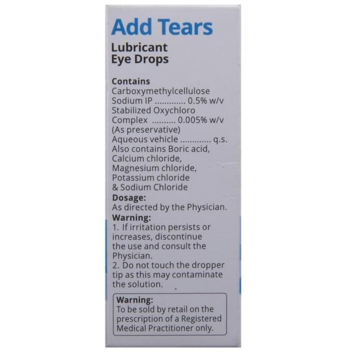 Q. What is Add Tears Lubricant Eye Drop used for?::: Add Tears Lubricant Eye Drop is a tear substitute. It is used as a lubricant for dry eyes. It is also used for the temporary relief of burning, irritation and/or discomfort due to dryness of eyes. Moreover, it is used to lubricate and re-wet soft and rigid gas permeable contact lenses. It is also indicated to relieve dryness, irritation, and discomfort that may be associated with lens wear.| Q. What are the side effects of Add Tears Lubricant Eye Drop?::: You may experience visual disturbances, eye discharge, and may notice medication residue while using this medicine. Some other side effects of this medicine include redness of the eye, eye irritation, burning and discomfort, eyelid swelling and itching of the eye.| Q. How should Add Tears Lubricant Eye Drop be stored?::: Store at or below 25?C and out of the reach of children. Do not touch the tip of the container to any surface and replace the cap after every use. Remember not to use the eye drops after the expiry date or after 30 days of opening it.| Q. How should Add Tears Lubricant Eye Drop be used?::: If you are using it for dry eyes, instil 1 or 2 drops in the affected eye(s) as needed. If you are using it to lubricate soft and rigid gas-permeable lenses, apply 1 to 2 drops to each eye with the lenses on as needed or as directed by your doctor. Blink several times after pouring the drops.| Q. Is Add Tears Lubricant Eye Drop bad?::: No, Add Tears Lubricant Eye Drop is a safe medicine. It is meant for external use only and is not harmful. In some patients, Add Tears Lubricant Eye Drop may cause eye irritation (burning and discomfort), eye pain, itchy eyes, visual disturbance. Immediately contact your doctor if any of these effects perists.