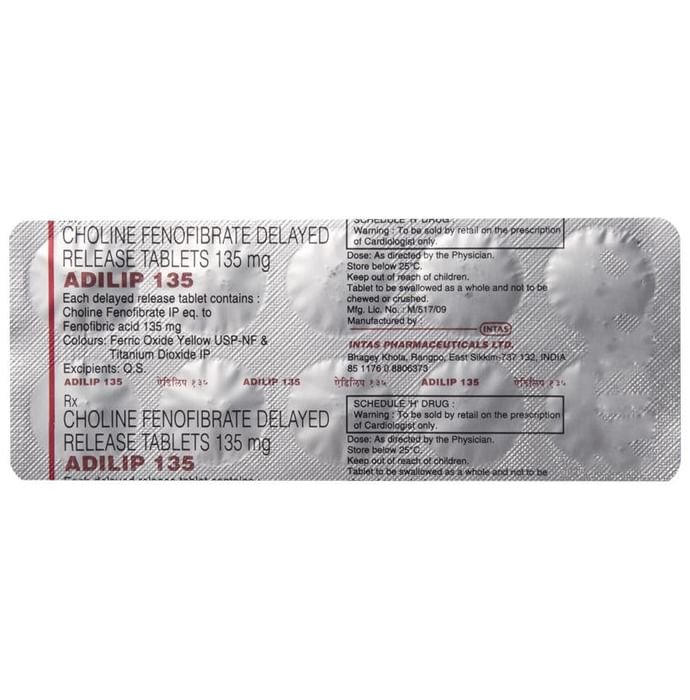 Adilip 135 Tablet DR is a lipid lowering medication. It works by lowering the levels of triglycerides and "bad" cholesterol (LDL), while raising the levels of "good" cholesterol (HDL).
