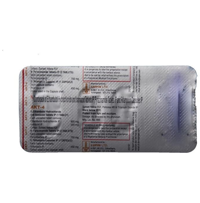 Q. How to take Akt 4 Kit?::: Take Akt 4 Kit on an empty stomach which means at least one hour before and two hours after a meal and with full glass of water.| Q. Can I drink alcohol while taking Akt 4 Kit?::: No, avoid drinking alcohol while taking Akt 4 Kit. Drinking alcohol will increase the risk of hepatitis caused by Akt 4 Kit because of isoniazid.| Q. Can the use of Akt 4 Kit cause discoloration of the urine?::: Yes, Akt 4 Kit contains Rifampicin. It can cause temporary discoloration of your teeth, sweat, urine, saliva and tears (red, orange or brown color). This side effect is usually not harmful. However, discoloration of urine can be a sign of liver damage. Contact your doctor if you notice discoloration of urine accompanied with stomach pain, loss of appetite and jaundice (yellowing of your skin or eyes).| Q. Can Akt 4 Kit cause visual impairment?::: Akt 4 Kit contains Ethambutol which may cause visual impairment. Inform the doctor immediately if you notice any changes in your eyesight.| Q. Can I discontinue Akt 4 Kit if I feel well?::: No, do not discontinue Akt 4 Kit. Take the proper course of a drug that has been prescribed for you even if you begin to feel better. If you stop taking Akt 4 Kit then your infection may become worse, difficult to treat and it may result in drug-resistant TB (drugs you are taking may no longer work).| Q. Can I take oral contraceptive pills while taking Akt 4 Kit?::: No, Akt 4 Kit can make birth control pills less effective. So, ask your doctor about using a birth control method which does not affect your hormone levels (such as a condom, diaphragm, spermicide).| Q. What are the instructions for storage and disposal of Akt 4 Kit?::: Keep this medicine in the container it came in, tightly closed. Store it according to the instructions mentioned on the pack or label. Dispose of the unused medicine. Make sure it is not consumed by pets, children and other people.