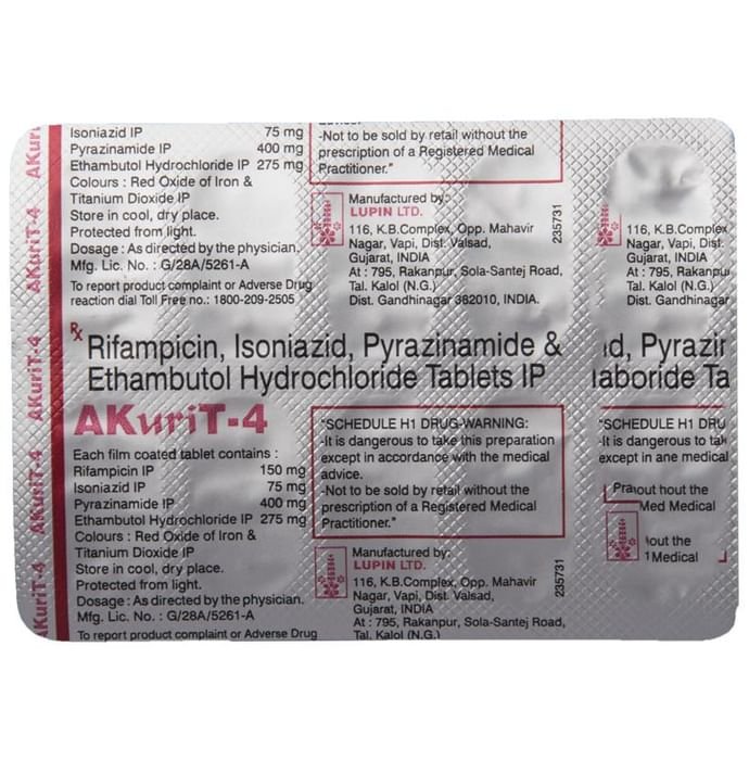 Akurit 4 Tablet is a combination medicine used in the treatment of tuberculosis. It prevents the growth of the microorganisms that cause the infection. Akurit 4 Tablet is a prescription medicine and it is to be taken it as suggested by the doctor. It should be taken in an empty stomach and take it at a fixed time to ensure better efficacy. Do not consume more than the recommended dose, as this may have harmful effects on your body. If you miss a dose, take it as soon as you remember. The course of the treatment must be completed even if you feel better. Sudden discontinuation of the treatment may affect the potency of the medicine. The medicine may take some to show its effects on the symptoms. However, it is advised to consult the doctor if you feel an aggravation of the condition or if your condition does not improve. Some common side effects of this medicine are nausea, vomiting, fever, dark-colored urine, sweating, increased saliva, etc. To cope up with the side effects, you should drink plenty of water. If any of the side effects get aggravated, you must consult your doctor immediately. Generally, serious side effects are rare. If you experience any allergic reaction (rashes, itching, swelling, shortness of breath, etc.), you must seek immediate medical help. Before taking this medicine, you should tell your doctor if you are taking any medicines for any health condition. Patients with liver and kidney ailments must take this medicine with proper consultation and caution. Pregnant or breastfeeding women should also consult with the doctor before taking it. Avoid drinking alcohol as it can cause excessive drowsiness with this medicine. It usually does not impair your ability to drive, but you should not drive if it makes you feel sleepy or dizzy. During the treatment, you must take adequate rest and eat a healthy diet for a faster recovery. While on the medication, your doctor may ask for a few laboratory and diagnostic tests to know the effects of the medicine on your body.