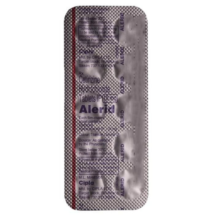 Alerid Tablet belongs to a group of medicines called antihistamines. It is used to treat various allergic conditions such as hay fever, conjunctivitis and some skin reactions, and reactions to bites and stings. It relieves watery eyes, runny nose, sneezing, and itching. Alerid Tablet can be taken with or without food. The dose required for you may vary depending on what you are taking it for. This medicine is usually taken in the evening but follow the advice of your doctor on how to take it. You may need this medicine only on days you have symptoms, but if you are taking it to prevent symptoms you should take it regularly. If you miss doses or stop taking it earlier than advised, your symptoms may come back. This medicine is generally very safe. The most common side effects include feeling sleepy or dizzy. These are usually mild and go away after a couple of days as your body adjusts. Consult your doctor if any of the side effects persist or worry you. You should avoid alcohol while taking this medicine. Before taking it, tell your doctor if you have any kidney problems or epilepsy. Your dose may need to be modified or this medicine may not be suitable. Some other medicines can interact with this medicine so let your healthcare team know what else you are taking. You should also talk to your doctor before using this medicine if you are pregnant or breastfeeding, although it is not thought to be harmful.