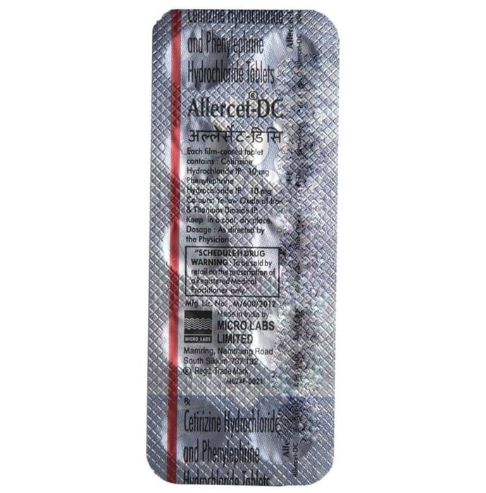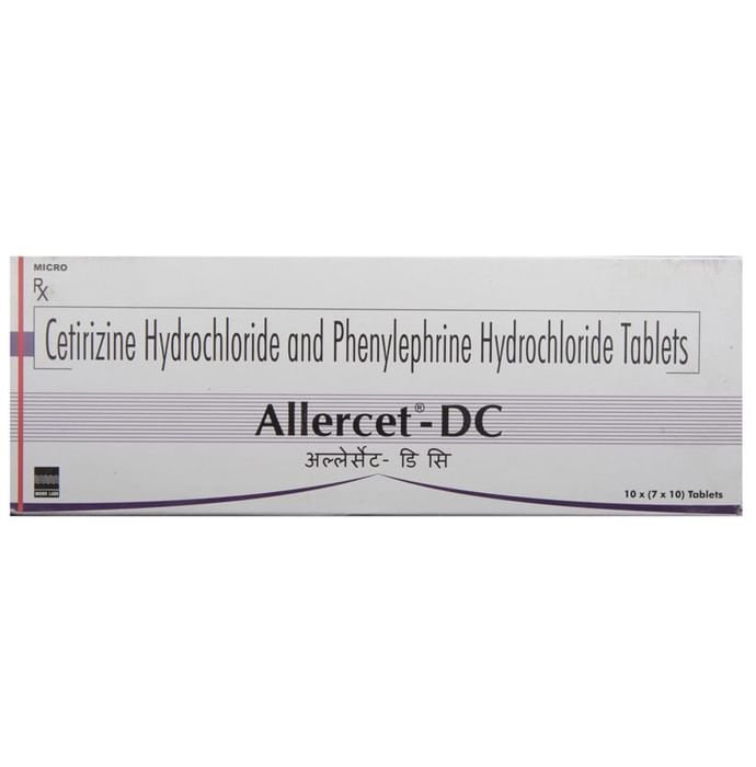 Allercet-DC Tablet is a combination medicine used in the treatment of allergy symptoms like runny nose, sneezing, throat irritation, watery eyes, and congestion or stuffiness in the nose. Allercet-DC Tablet is taken with or without food in a dose and duration as advised by the doctor. The dose you are given will depend on your condition and how you respond to the medicine. You should keep taking this medicine for as long as your doctor recommends. If you stop treatment too early your symptoms may come back and your condition may worsen. Let your healthcare team know about all other medications you are taking as some may affect, or be affected by this medicine. The most common side effects are dryness in the mouth, headache, nausea, vomiting, and tiredness. Most of these are temporary and usually resolve with time. Contact your doctor straight away if you are at all concerned about any of these side effects. It can also cause dizziness and sleepiness, so do not drive or do anything that requires mental focus until you know how this medicine affects you. Avoid drinking alcohol while taking this medicine as it can worsen your sleepiness. Never support self-medication or recommend your medicine to another person. It is beneficial to have plenty of fluids while taking this medication. Before taking it, you should tell your doctor if you have any kidney diseases so that your doctor can prescribe a suitable dose for you. Also tell your doctor if you are pregnant, planning pregnancy, or breastfeeding.