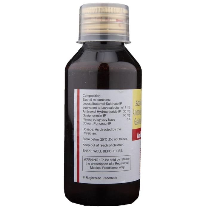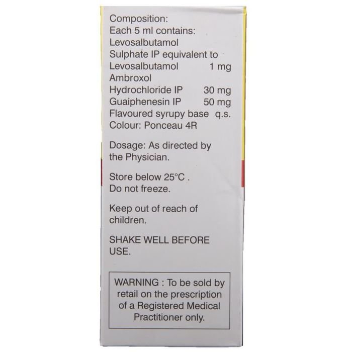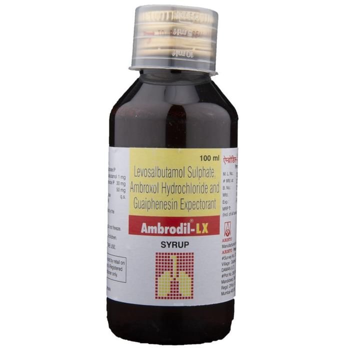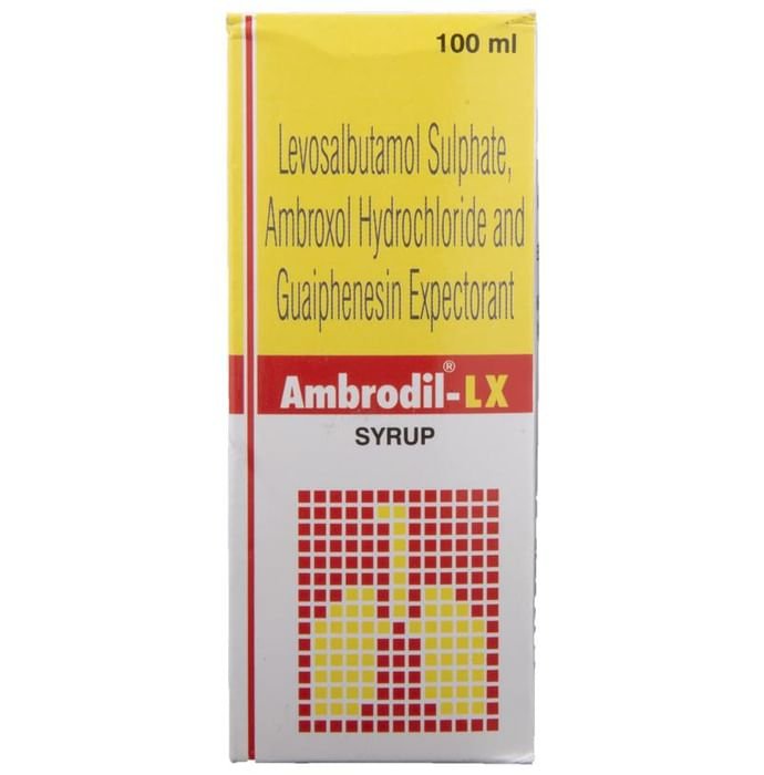 Q. What is Ambrodil-LX Syrup?::: Ambrodil-LX Syrup is a combination of three medicines: Ambroxol, Levosalbutamol / Levalbuterol, Guaifenesin. It is used in the treatment of cough with mucus. Ambroxol is a mucolytic. It thins and loosens the mucus (phlegm) which makes it easier to cough out. Levosalbutamol is a bronchodilator and it works by relaxing the muscles of the airways and widens the airways. Guaifenesin is an expectorant. It works by decreasing the stickiness of the mucus (phlegm) and helps to remove it easily from the airways.| Q. Is it safe to use Ambrodil-LX Syrup?::: Yes, it is safe to use Ambrodil-LX Syrup in most of the patients. However, in some patients it may cause common side effects like nausea, vomiting, diarrhea, stomach pain, allergic reaction, dizziness, headache, rash, urticaria, tremor, palpitations, muscle cramp and increased heart rate. Inform your doctor if you experience any persistent problem while taking this medicine.| Q. Are there any specific contraindications associated with the use of Ambrodil-LX Syrup?::: Use of Ambrodil-LX Syrup is considered to be harmful in patients with a history of allergy to any of the active or inactive ingredients. Levosalbutamol and beta-blockers like propranolol should not usually be taken together.| Q. Can the use of Ambrodil-LX Syrup cause dizziness?::: Yes, the use of Ambrodil-LX Syrup can cause dizziness (feeling faint, weak, unsteady or lightheaded) in some patients. If you feel dizzy or lightheaded, it is better to rest for sometime and resume once you feel better. Do not drive or use any machines.| Q. Can the use of Ambrodil-LX Syrup cause diarrhea?::: Yes, the use of Ambrodil-LX Syrup can cause diarrhea. In case you experience diarrhea, drink plenty of water or other fluids. Talk to your doctor if diarrhea persists and you notice any signs of dehydration, like less urination with dark colored and strong-smelling urine. Do not take any other medicine without consulting your doctor.| Q. What are the recommended storage conditions for Ambrodil-LX Syrup?::: Keep this medicine in the container or the pack it came in, tightly closed. Store it according to the instructions mentioned on the pack or label. Dispose of the unused medicine. Make sure it is not consumed by pets, children and other people.