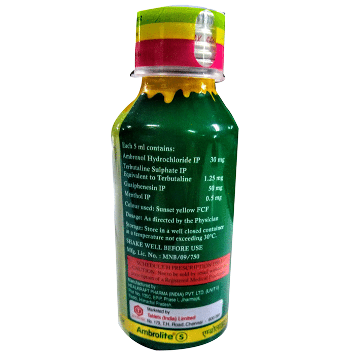 Q. Will a higher than the recommended dose of Ambrolite-S Expectorant be more effective?::: No, taking higher than the recommended dose may not be more effective, rather it may increase the chances of having increased side effects. If you do not find any relief in your symptoms while taking Ambrolite-S Expectorant, please consult your doctor.| Q. In which type of cough will the doctor prescribe Ambrolite-S Expectorant?::: Ambrolite-S Expectorant is indicated in the treatment of a cough that is associated with excessive mucus secretion.| Q. Are there any contraindications associated with use of Ambrolite-S Expectorant?::: It is not recommended to use Ambrolite-S Expectorant if you have hypersensitivity to any of the components of the formulation. Avoid the medication if you have pre-existing ischaemic heart disease, significant risk factors for ischaemic heart disease and gastric ulceration.| Q. What are the instructions for the storage and disposal of Ambrolite-S Expectorant?::: Keep this medicine in the container it came in, tightly closed. Store it according to the instructions mentioned on the pack or label. Dispose of the unused medicine. Make sure it is not consumed by pets, children and other people.|