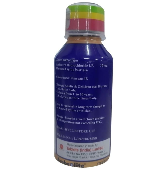 In Treatment of Respiratory tract disorders associated with viscid mucus Ambrolite Syrup helps to loosen thick mucus, making it easier to cough out. This makes it easier for air to move in and out. It will relieve symptoms such as tightness in your chest, shortness of breath, wheezing and coughing and help you carry out your daily activities more easily. This medicine is safe and effective. It usually starts to work within a few minutes and the effects can last up to several hours. Take it as prescribed by the doctor. Do not stop using it unless you are advised to by your doctor. Taking this medicine enables you to live your life more freely without worrying so much about things that set off your symptoms.