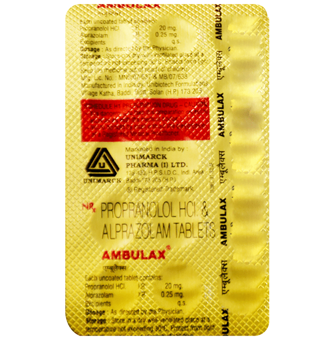 Ambulax Tablet is a combination of two medicines: Alprazolam and Propranolol. Alprazolam is a benzodiazepine. It works by increasing the action of GABA, a chemical messenger which suppresses the abnormal and excessive activity of the nerve cells in brain. Propranolol is a beta blocker which blocks the action of certain chemical messengers on the heart and blood vessels. This reduces heart rate, blood pressure, and strain on the heart.