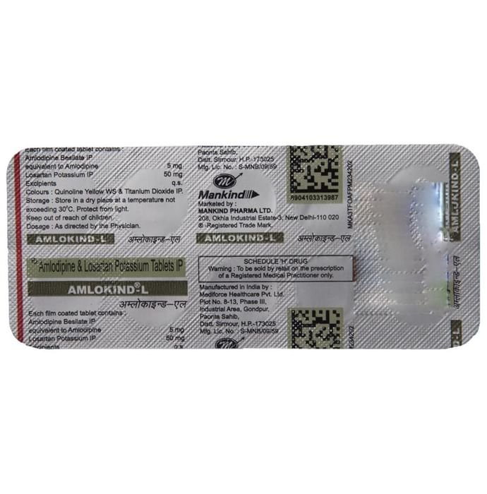 Amlokind-L Tablet is a combination of two medicines: Losartan and Amlodipine which lower blood pressure effectively. Losartan is an angiotensin receptor blocker (ARB) and Amlodipine is a calcium channel blocker (CCB). They work by relaxing the blood vessels and making the heart more efficient at pumping blood throughout the body.