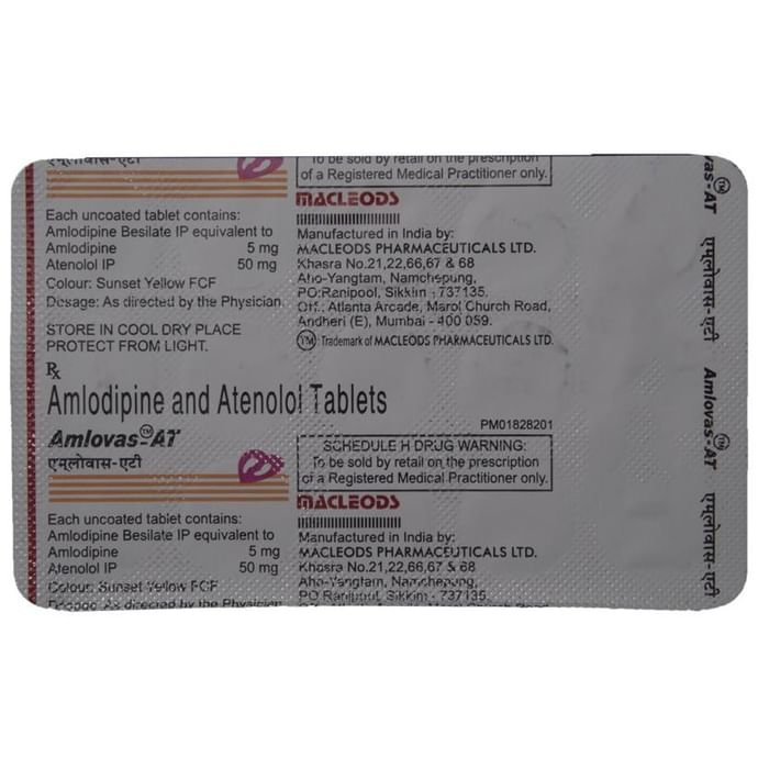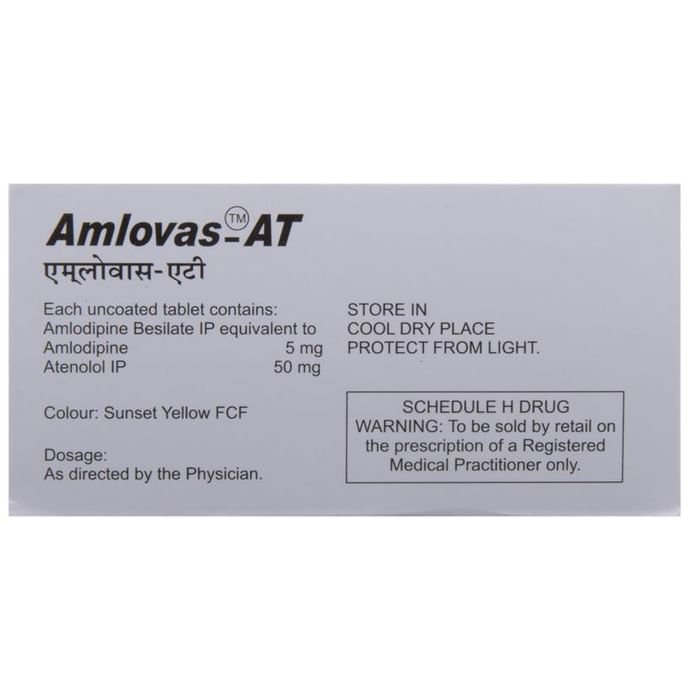 Q. What lifestyle changes should be made while using Amlovas-AT Tablet?::: Making lifestyle changes can boost your health while taking Amlovas-AT Tablet. Avoid smoking, as smoking increases your risk of having heart attack and stroke. If you are overweight or obese, try to lose weight. You should maintain a healthy diet by including fruits and vegetables in your meals. Regular exercise can make your heart strong and reduce the risk of heart attack.| Q. Can I stop taking Amlovas-AT Tablet if I feel well?::: No, keep using Amlovas-AT Tablet as advised by your doctor, even if you feel well. Stopping Amlovas-AT Tablet suddenly may lead to serious complications such as heart attack and stroke.| Q. Are there any special instructions regarding the storage and disposal of this medicine?::: Keep this medicine in the container or the pack it came in, tightly closed. Store it according to the instructions mentioned on the pack or label. Dispose of the unused medicine. Make sure it is not consumed by pets, children and other people.| Q. What are the contraindications associated with the use of Amlovas-AT Tablet?::: Amlovas-AT Tablet is considered to be harmful for patients who are allergic to amlodipine, atenolol or any of its ingredients. It should be avoided in patients with history of asthma or lung disease. Also, inform your doctor about your medical history and the medicines you might be taking.| Q. Can the use of Amlovas-AT Tablet cause headache?::: Yes, the use of Amlovas-AT Tablet can cause headaches at the beginning of the treatment. Headaches usually go away after the first week of the treatment. Contact your doctor if the headaches are frequent and do not go away.| Q. Can I feel dizzy after taking Amlovas-AT Tablet?::: Yes, the use of Amlovas-AT Tablet can make you feel dizzy. This may occur when you suddenly rise up from lying or sitting position. To lower the chance of feeling dizzy or passing out, rise slowly if you have been sitting or lying down.