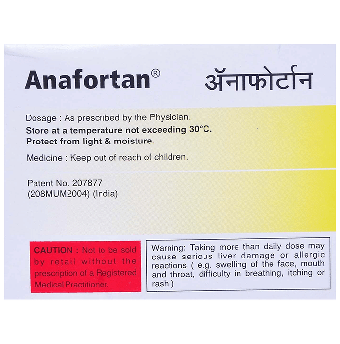 Q. Can the use of Anafortan 25 mg/300 mg Tablet cause damage to liver?::: Anafortan 25 mg/300 mg Tablet contains Paracetamol. Very high doses of this medicine is known to harm the liver. Also, avoid drinking alcohol while taking this medicine, as it may further increase your risk of liver damage. Use of this medicine should preferably be avoided in patients with underlying liver disease. Contact your doctor immediately if you notice any early signs and symptoms of liver damage. These symptoms may include fever, rash, loss of appetite, nausea, vomiting, fatigue, stomach pain, dark urine, yellow skin or eyes and abnormal liver enzymes.| Q. Can I drink alcohol while taking Anafortan 25 mg/300 mg Tablet?::: No, avoid drinking alcohol while taking Anafortan 25 mg/300 mg Tablet. Drinking alcohol will increase the risk of serious side effects caused by Anafortan 25 mg/300 mg Tablet.| Q. What are the instructions for storage and disposal of Anafortan 25 mg/300 mg Tablet?::: Keep this medicine in the container it came in, tightly closed. Store it according to the instructions mentioned on the pack or label. Dispose of the unused medicine. Make sure it is not consumed by pets, children and other people.|