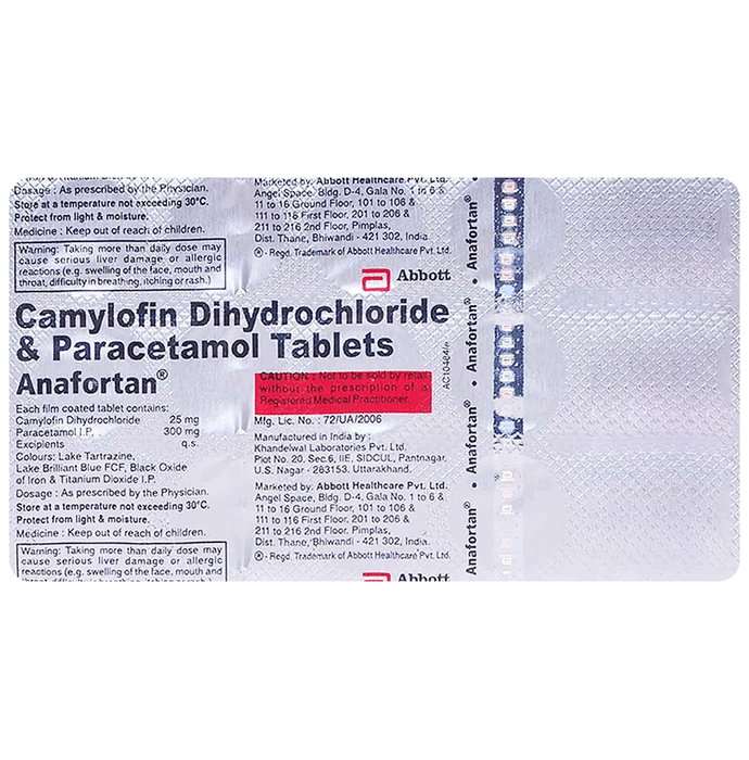 Anafortan 25 mg/300 mg Tablet is a combination of two medicines: Camylofin and Paracetamol, which relieves abdominal pain. Camylofin is an anti-cholinergic which relaxes the muscles in the stomach and gut (intestine) and stops sudden muscle contractions (spasms). By doing this, it relieves cramps, pain, bloating, and discomfort. Paracetamol is an analgesic (pain reliever) and an anti-pyretic (fever reducer) which works by blocking the release of certain chemical messengers that causes fever and pain.
