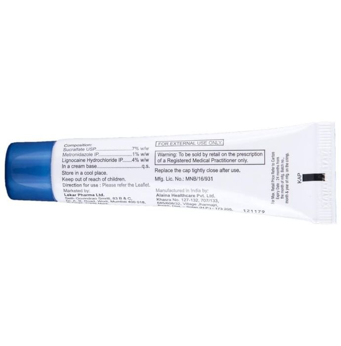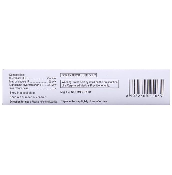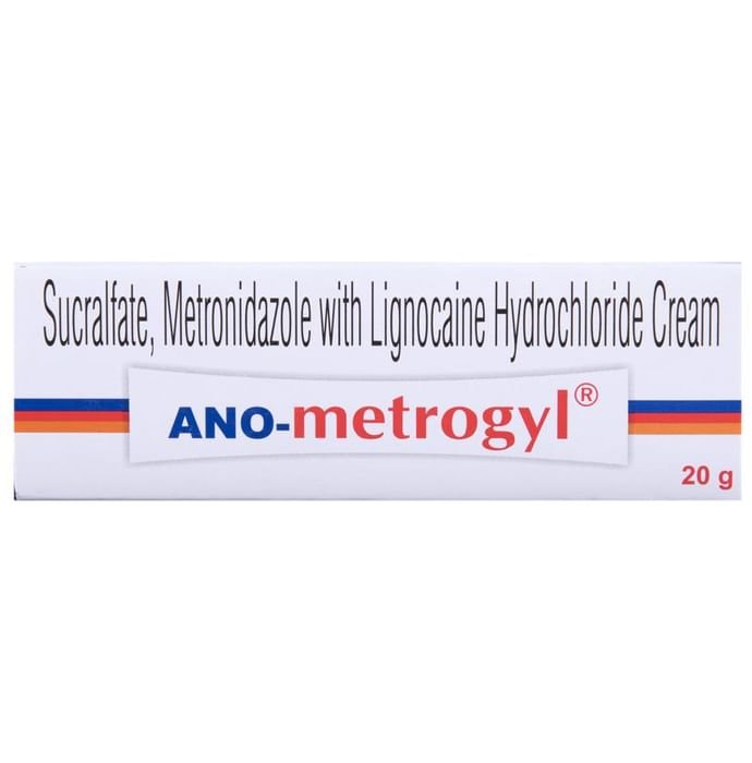 Ano Metrogyl Cream is a combination of three medicines: Lidocaine, Metronidazole and sucralfate. Lidocaine is a local anesthetic. It works by blocking pain signals from the nerves to the brain which decreases pain sensation. Metronidazole is an antibiotic that kills any harmful bacteria in the anal region and prevents infections. Sucralfate is a protective agent that forms a protective layer on the skin of the anal region and prevents any irritation, pain or burning sensation in the anus. This promotes wound healing and formation of new healthy skin.