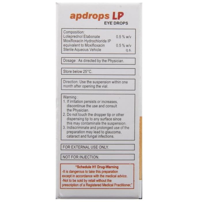 Apdrops LP Eye Drop BAK Free is a prescription medicine used to treat eye infection with inflammation. It kills and stops the growth of bacteria and helps in relieving symptoms such as redness, itching, and swelling. Apdrops LP Eye Drop BAK Free is to be used only in the affected eye. Read the label carefully for instruction before you use the medicine. Use it in the exact dose and duration as advised by the doctor or as instructed in the label. Wash your hands before using this medicine. Complete your dose even if you feel better. Stopping the medicine too early may bring back the infection. Use of this medicine may cause irritation and discomfort immediately on application. These are usually temporary and resolve with time. However, if they persist or get worse, inform your doctor. In case of accidental contact with your ears, nose, or mouth, immediately rinse it with water. Inform your doctor if you have a known allergy to any of the ingredients in this medicine or if you are taking any other medication. It is advised not to drive or operate heavy machinery immediately after using this medicine as it may cause temporary blurring of vision and may affect your ability to drive.
