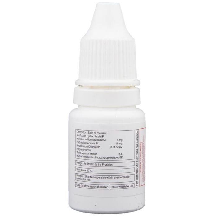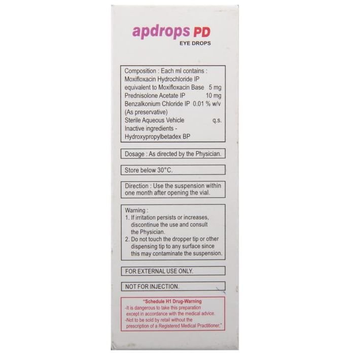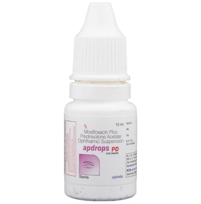 Apdrops PD Eye Drop is a combination of two medicines: Moxifloxacin and Prednisolone. Moxifloxacin is an antibiotic which prevents bacterial cells from dividing and repairing, thereby killing the bacteria. This treats your eye infection. Prednisolone is a steroid which blocks the production of certain chemical messengers (prostaglandins) that make the eye red, swollen and itchy.