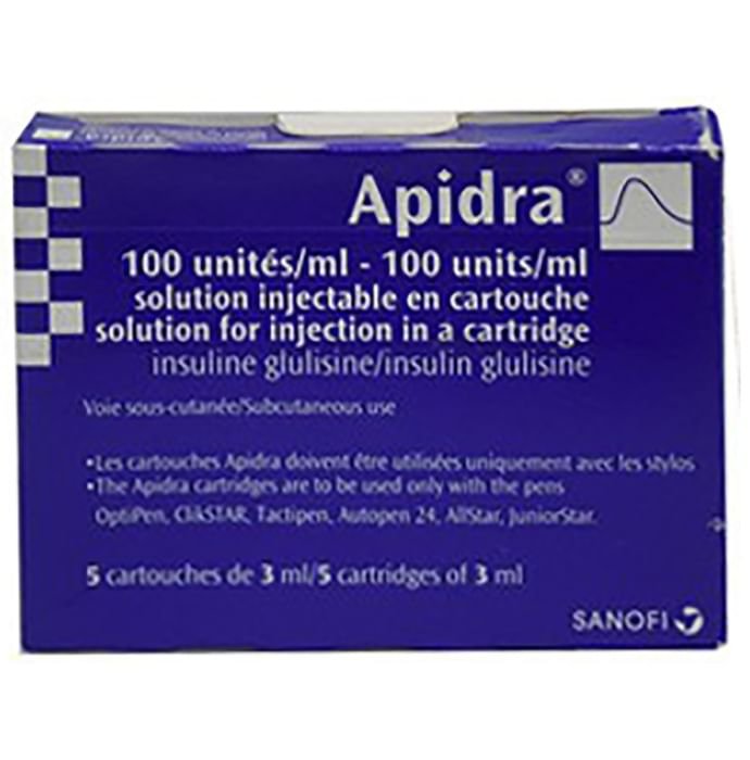 Apidra 100IU Cartridge is used to improve blood sugar control in people with type 1 and type 2 diabetes mellitus. It is a fast-acting type of insulin that helps to lower blood sugar levels after meals and reduce the chances of developing serious complications of diabetes. Apidra 100IU Cartridge is normally prescribed along with a long-acting type of insulin or other diabetes medicines. Your doctor or nurse will teach you the correct way of injecting it under the skin. It should be taken 15 minutes before a meal or within 20 minutes after starting a meal. Do not stop taking it unless your doctor tells you to. It is only part of a treatment program that should also include a healthy diet, regular exercise, and weight reduction as advised by your doctor. Check your blood sugar levels regularly, keep track of your results and share them with your doctor. This is very important to work out the correct dose of the medicine for you. The most common side effects of this medicine include hypoglycemia, allergic reactions, injection site reactions, lipodystrophy, itching, and rash. To prevent these, it is important to always inject the correct dose of medicine, have regular meals (do not skip), and monitor your blood sugar levels regularly. Do not use this medicine when you have low blood sugar levels (hypoglycemia). Tell your doctor if you have ever had kidney, liver, or heart problems before starting treatment. Pregnant or breastfeeding women should consult their doctor before using it.