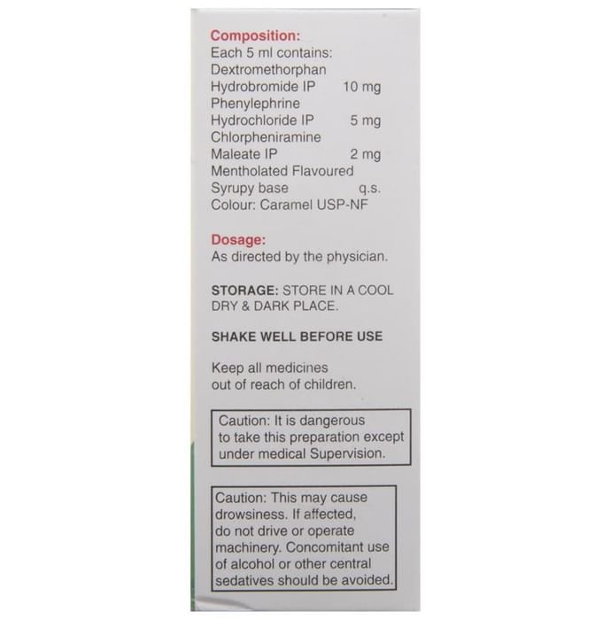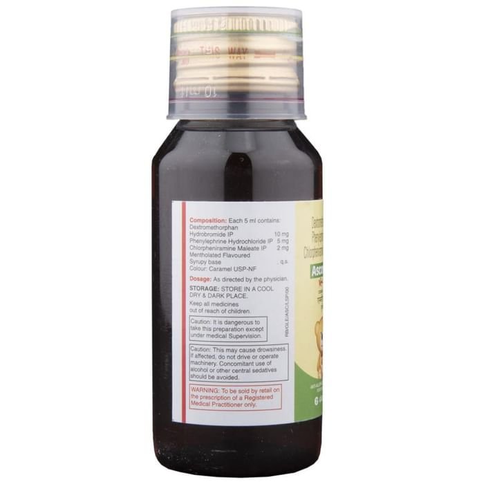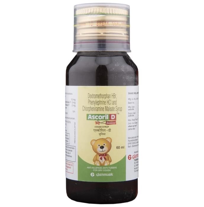 Ascoril D Junior Cough Syrup is a combination of three medicines: Phenylephrine, Chlorpheniramine Maleate and Dextromethorphan Hydrobromide, which relieves dry cough. Phenylephrine is a decongestant which narrows the small blood vessels providing relief from congestion or stuffiness in the nose. Chlorpheniramine Maleate is an antiallergic which relieves allergy symptoms like runny nose, watery eyes and sneezing. Dextromethorphan Hydrobromide is a cough suppressant that relieves cough by reducing the activity of cough center in the brain.