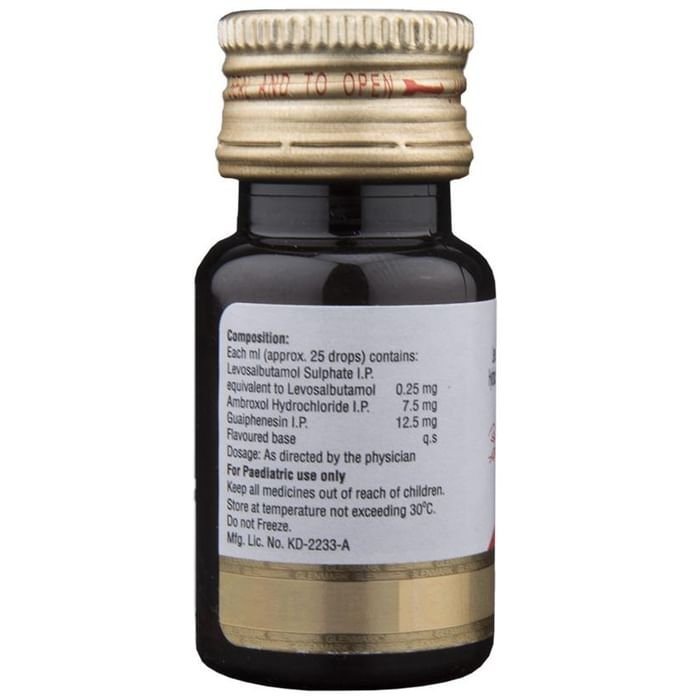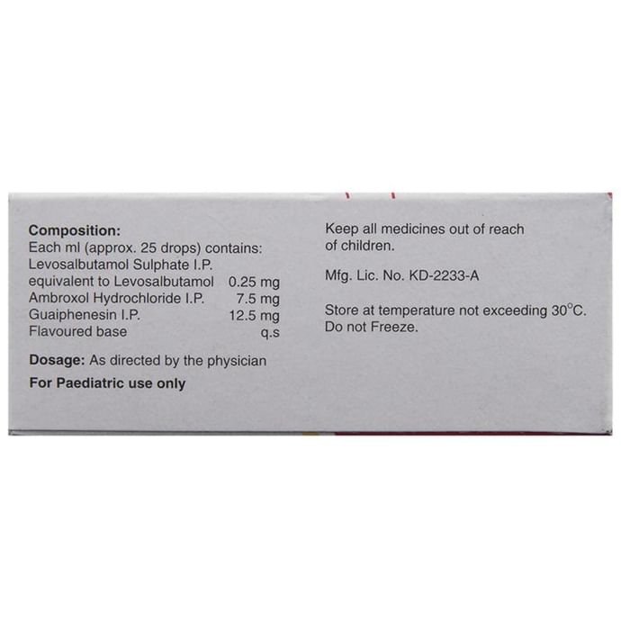 Ascoril LS Drops is a combination of three medicines: Ambroxol, Levosalbutamol, and Guaifenesin, which relieves cough with mucus. Ambroxol is a mucolytic that thins and loosens mucus (phlegm), making it easier to cough out. Levosalbutamol is a bronchodilator. It works by relaxing the muscles in the airways and widens the airways. Guaifenesin is an expectorant that decreases the stickiness of mucus (phlegm) and helps in its removal from the airways. Together, they make breathing easier.