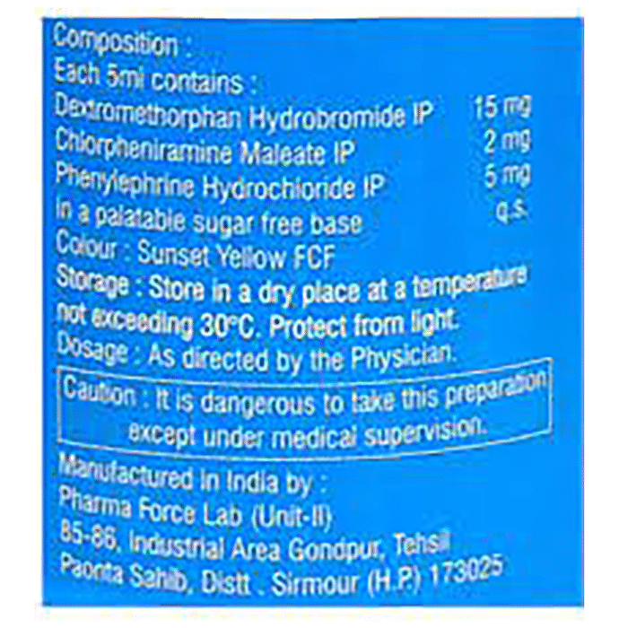 Asthakind-DX Syrup Sugar Free is a combination of three medicines: Phenylephrine, Chlorpheniramine Maleate and Dextromethorphan Hydrobromide, which relieves dry cough. Phenylephrine is a decongestant which narrows the small blood vessels providing relief from congestion or stuffiness in the nose. Chlorpheniramine Maleate is an antiallergic which relieves allergy symptoms like runny nose, watery eyes and sneezing. Dextromethorphan Hydrobromide is a cough suppressant that relieves cough by reducing the activity of cough center in the brain.