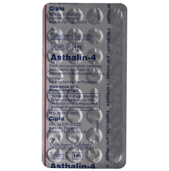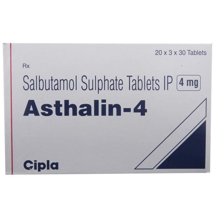 Q. What would happen if I take higher than the recommended dose of Asthalin 4 Tablet?::: Taking a higher than the recommended dose of Asthalin 4 Tablet may cause seizures, chest pain, nervousness, headache, dry mouth, nausea, dizziness and lack of energy. High doses of Asthalin 4 Tablet may also cause fast, irregular or pounding heartbeat, uncontrollable shaking of any part of the body, and difficulty falling asleep or staying asleep. In any such case, seek immediate medical attention.| Q. Is it safe to take Asthalin 4 Tablet if I have heart disease?::: Yes, Asthalin 4 Tablet is considered safe, but its use depends on the severity of your heart problem. If you experience chest pain or any other symptom of worsening heart disease while taking Asthalin 4 Tablet, seek immediate medical advice.| Q. Being a diabetic, what should I remember while taking Asthalin 4 Tablet?::: Asthalin 4 Tablet may cause blood sugar levels to rise. Therefore, your doctor may adjust your dose of insulin or antidiabetic medicines. Keep a regular check on your blood glucose levels and do not miss any appointments. Consult your doctor if you experience a sudden rise in blood sugar levels.| Q. I have started using Asthalin 4 Tablet and I am experiencing headaches and shakiness. Is this because of Asthalin 4 Tablet and will these go away?::: Yes, it could be due to Asthalin 4 Tablet. Feeling shaky is a common side effect of Asthalin 4 Tablet which goes away after some time. For headaches, drink plenty of water, get sufficient rest and avoid alcohol. Usually headaches go away after a week. If they persist for a long time, contact your doctor.| Q. When should I take Asthalin 4 Tablet?::: Use Asthalin 4 Tablet as and when you need it. Asthalin 4 Tablet relieves the symptoms of asthma like coughing, shortness of breath and tightness in the chest. You can also take it to prevent asthma attacks in circumstances where you know it may occur (e.g., after strenuous exercise or unavoidable exposure to allergen).| Q. Can I smoke if I have been prescribed Asthalin 4 Tablet?::: No, you should not smoke while taking Asthalin 4 Tablet. Smoking irritates the lungs. The medicine may make breathing more difficult, especially in patients who have asthma. Take advice from your doctor if you are finding it hard to avoid smoking.