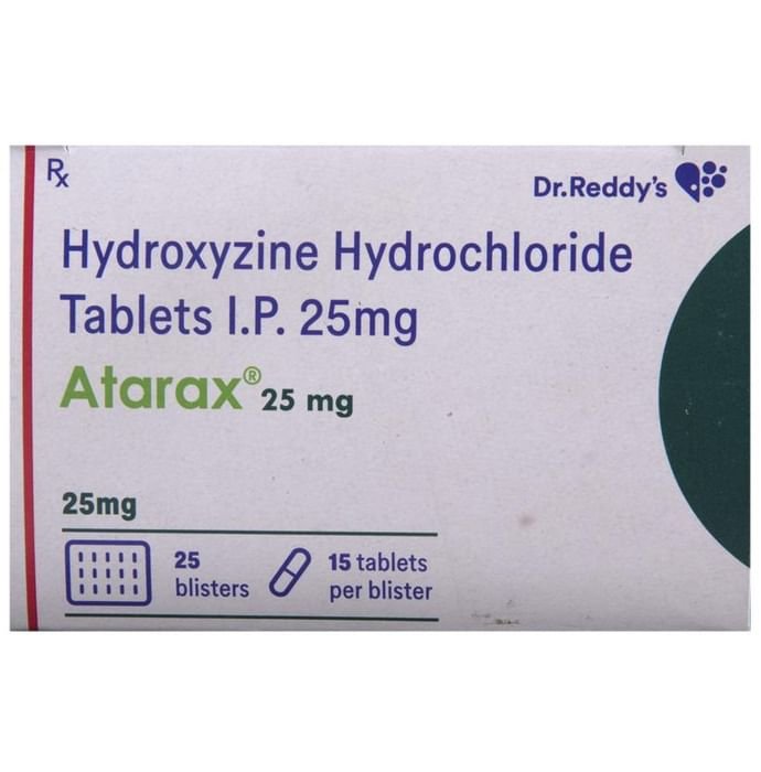 Atarax 25mg Tablet is used to treat anxiety and helps to get relaxed before or after surgery. It is also used to treat symptoms of skin allergy like itching, swelling, and rashes in conditions such as eczema, dermatitis, and psoriasis. Atarax 25mg Tablet should be taken with or without food. Take it exactly as your doctor has prescribed. The dose and how often you take it depends on what you are taking it for. Your doctor will decide how much you need to improve your symptoms. Take it for as long as it is prescribed for you. In case, you have missed any doses, take the next dose as soon as you remember it. However, you should never take a double dose. The most common side effects of this medicine include sedation, nausea, vomiting, stomach upset, and constipation. If these bother you or appear serious, let your doctor know. There may be ways of reducing or preventing them. You must avoid driving or attention-seeking activity while on treatment. Before taking this medicine, let your doctor know if you have heart problems or have high blood pressure, have liver or kidney problems. Inform your doctor if you are pregnant, or breastfeeding. Your doctor should also know about all other medicines you are taking as many of these may make this medicine less effective or change the way it works. Generally, it is advised to avoid alcohol while on treatment.