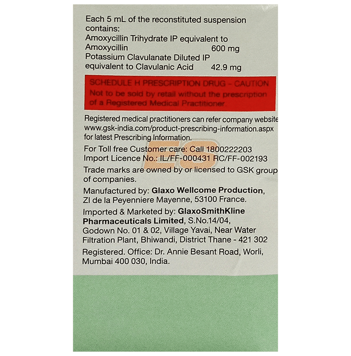 | Salt Composition | Amoxycillin (600mg/5ml) + Clavulanic Acid (42.9mg/5ml) |