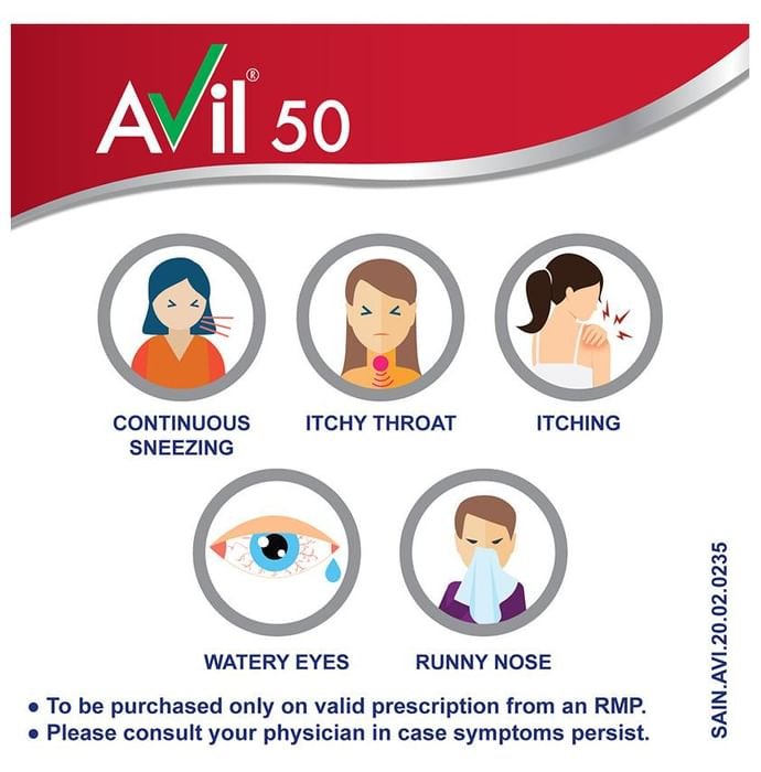 Avil 50mg Tablet is an antiallergic medication used in the treatment of various allergic conditions. It provides relief from runny nose, sneezing, congestion, itching, and watery eyes. Avil 50mg Tablet should be taken with food, but take it at the same time every day to get the most benefit. The dose and how often you take it depends on what you are taking it for. Your doctor will decide how much you need to improve your symptoms. You should take this medicine for as long as it is prescribed for you. In case, you have missed any doses, take the next dose as soon as you remember it. However, you should never take a double dose. Sleepiness is the most common side effect of this medicine. Avoid driving or attention-seeking activity. If these bother you or appear serious, let your doctor know. There may be ways of reducing or preventing them. In some cases, it may cause dry mouth, so it is advised to drink more water, always carry sugar candy or maintain oral hygiene. Before taking this medicine, let your doctor know if you have glaucoma or have asthma issues, or have high blood pressure. Inform your doctor if you are pregnant, or breastfeeding. Your doctor should also know about all other medicines you are taking as many of these may make this medicine less effective or change the way it works. Generally, it is advised to avoid alcohol while on treatment.