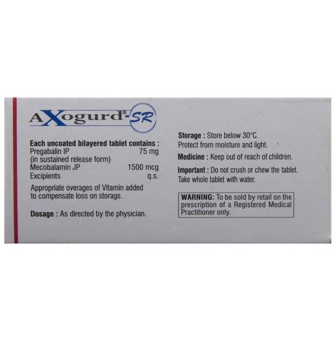 Q. What is Axogurd-SR Tablet?::: Axogurd-SR Tablet is a combination of two medicines: Pregabalin and Methylcobalamin. This medicine is useful in the treatment of nerve pain (neuropathic pain). It calms the damaged or overactive nerves by acting on the brain, thereby decreasing the pain sensation. It also helps in the regeneration of damaged nerves in the body.| Q. Can I stop taking Axogurd-SR Tablet when my pain is relieved?::: No, you should not stop taking Axogurd-SR Tablet even if your pain is relieved. Continue to take it as advised by your doctor. If you suddenly stop taking Axogurd-SR Tablet, you may experience withdrawal symptoms such as anxiety, sleeping difficulties, nausea, pain and sweating. You may need to gradually taper the use of Axogurd-SR Tablet before you stop the medication completely.| Q. How to manage weight gain associated with the use of Axogurd-SR Tablet?::: Axogurd-SR Tablet can make you feel hungry which might make you eat more, thereby increasing your chances of putting on weight. However, preventing weight gain is easier than losing the increased weight. Try to eat a healthy balanced diet without increasing your portion sizes (per-meal intake). Do not eat food items that contain a lot of calories, such as soft drinks, oily food, chips, cakes, biscuits, and sweets. If you feel hungry between meals, avoid eating junk food and eat fruits, vegetables and low-calorie foods. Regular exercise will help prevent weight gain. If you maintain good eating habits and exercise regularly, you might not gain any weight.| Q. Can the use of Axogurd-SR Tablet cause sleepiness or drowsiness?::: Yes, Axogurd-SR Tablet may make you feel drowsy or you may suddenly fall asleep during your daily activities. Sometimes, you might not even feel drowsy or have any other warning signs before you suddenly fall asleep. Avoid driving a car, operating machinery, working at heights or participating in potentially dangerous activities at the beginning of your treatment until you know how the medicine affects you. Inform your doctor if you experience such episodes while you are taking this medicine.| Q. Are there any serious side effects associated with the use of Axogurd-SR Tablet?::: Serious side effects caused because of the use of Axogurd-SR Tablet are uncommon and rare. However, it may cause serious side effects like allergic reaction, suicidal thoughts or swelling of limbs (hands, legs or feet). Stop taking Axogurd-SR Tablet and contact your doctor if you have any signs of these serious side effects. Signs of an allergic reaction include swelling of your face, mouth, lips, gums, tongue and neck. Allergic reactions can also lead to trouble in breathing, skin rash, hives (raised bumps) or blisters. Pay attention to any changes, especially sudden changes in mood, behaviors, thoughts or feelings, or if you have suicidal thoughts.| Q. How long will the Axogurd-SR Tablet take to act?::: An initial benefit with Axogurd-SR Tablet may be seen after 2 weeks of treatment. However, it may take around 2-3 months or more (in some patients) to see the full benefits.| Q. What if I forget to take Axogurd-SR Tablet?::: If you forget to take the scheduled dose of Axogurd-SR Tablet and it is almost time for your next dose, skip the dose you missed and take your next dose at the scheduled time. Otherwise, take it as soon as you remember, and then go back to taking your medicine as you would normally. Do not take a double dose to make up for the dose you missed because this may increase the risk of unwanted side effects. If you are not sure what to do, consult your doctor about how to manage a situation like this.| Q. Will a higher than the recommended dose of Axogurd-SR Tablet be more effective?::: No, taking a higher than the recommended dose may not be more effective, rather it may increase the chances of having some serious side effects and toxicity. If you experience increased severity of your symptoms that are not relieved by the recommended doses, please consult your doctor for re-evaluation.| Q. Can I drink alcohol while taking Axogurd-SR Tablet?::: No, do not drink alcohol while taking Axogurd-SR Tablet. Drinking alcohol can increase the severity of drowsiness or sleepiness caused by Axogurd-SR Tablet.| Q. How often should I see the doctor ?::: You may need to see your doctor regularly if you have started to take Axogurd-SR Tablet. However, you must consult your doctor if the advised dosage of Axogurd-SR Tablet does not improve your symptoms or you continue experiencing some unwanted side effects that affect your routine activities.| Q. Are there any special instructions regarding storage and disposal of this medicine?::: Keep your tablets in the pack until it is time to take them. Store them in a cool dry place. Store them out of sight and reach of children. Unused medications should be disposed of in special ways to ensure that pets, children and other people cannot consume them.