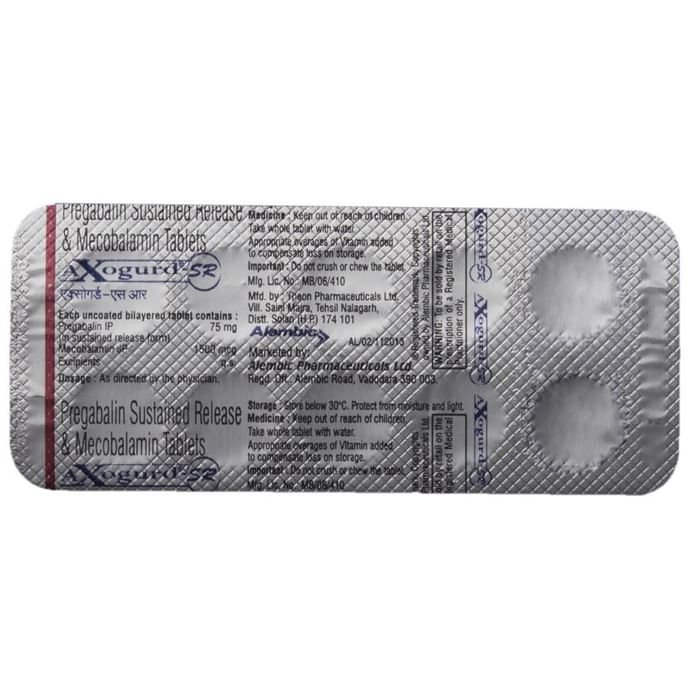 Axogurd-SR Tablet is a combination of two medicines: Methylcobalamin and Pregabalin. Methylcobalamin is a form of vitamin B which helps in the production of myelin, a substance that protects nerve fibers and rejuvenates damaged nerve cells. Pregabalin is an alpha 2 delta ligand which decreases the pain by modulating calcium channel activity of the nerve cells. Together, they relieve neuropathic pain (pain from damaged nerves).