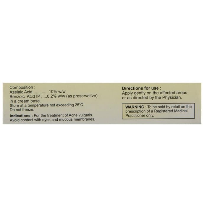 Q. What amount of Aziderm 10% Cream should be applied?::: Use it exactly as recommended by your doctor. As a guide, if the whole of your face is affected, use 2.5 cm (approx. 0.5 g) of cream each time. If you have acne on your chest and back, as well as your face, adjust the amount of cream accordingly.| Q. How long does Aziderm 10% Cream take to show complete effect?::: The time taken by Aziderm 10% Cream to cure acne varies from individual to individual. It depends upon the severity of acne at the start of the treatment. Usually, the condition shows a distinct improvement after about 4 weeks. For best results, your doctor may prescribe to use Aziderm 10% Cream regularly for several months. However, you should not use Aziderm 10% Cream for more than 12 months at any time.| Q. Does Aziderm 10% Cream lighten skin?::: Aziderm 10% Cream may cause change in skin color, especially if you have dark colored skin. If you notice any change in your skin color, contact your doctor immediately.| Q. Does Aziderm 10% Cream help blackheads?::: Aziderm 10% Cream works by killing the bacteria (Propionibacterium acnes) that is responsible for acne. It also reduces growth of the harder outermost skin cells that block the pores of the skin to cause blackheads and whiteheads.| Q. Can Aziderm 10% Cream be used to treat melasma?::: Aziderm 10% Cream is not approved for treating melasma. It should be used to treat acne and rosacea (a skin disease that causes redness, flushing, and pimples on the face). However, it may be used for melasma if prescribed by the doctor. | Q. How should Aziderm 10% Cream be applied?::: The area to be treated should be thoroughly washed with water. If the skin is greasy, use a mild cleanser. You should dry the skin before applying the cream. After applying the cream, rub it gently. Wash your hands thoroughly after using it.| Q. How often should Aziderm 10% Cream be used?::: Aziderm 10% Cream should be applied to the affected areas of the skin twice daily (morning and evening), unless the doctor directs otherwise. People with very sensitive skin should use it only once a day (in the evening) during the first week of the treatment. After the first week, they can proceed to using it twice a day.