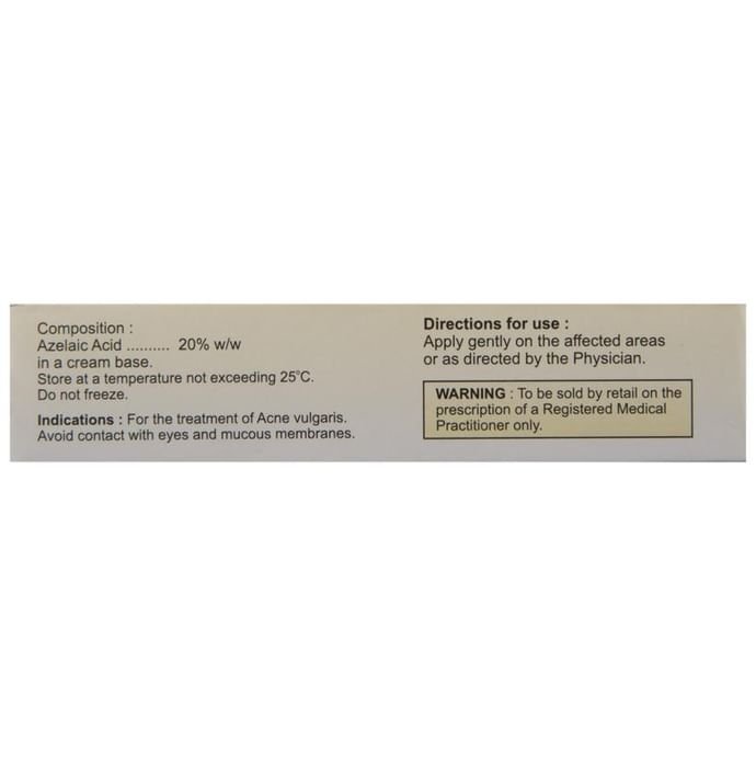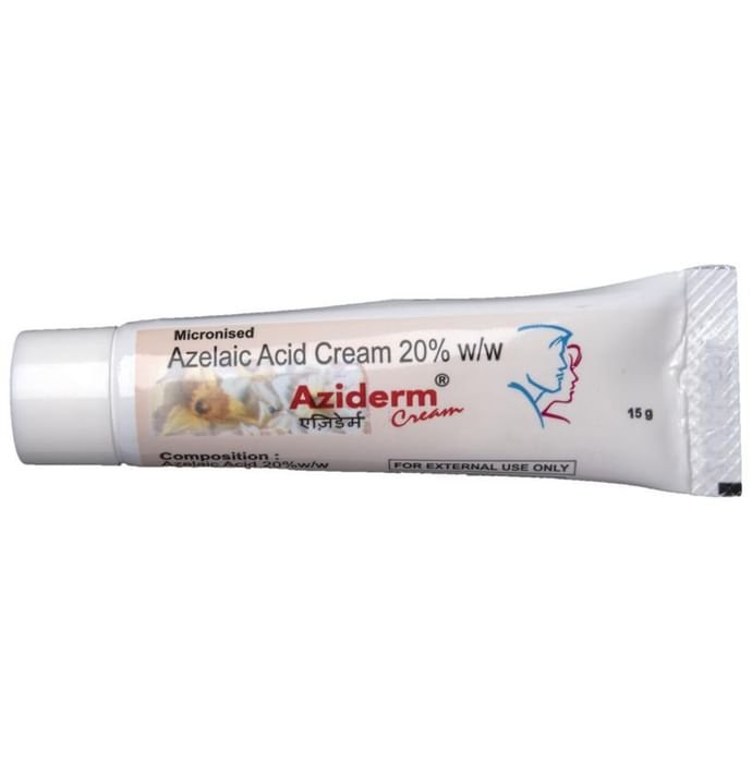 Q. What amount of Aziderm 20% Cream should be applied?::: Use it exactly as recommended by your doctor. As a guide, if the whole of your face is affected, use 2.5 cm (approx. 0.5 g) of cream each time. If you have acne on your chest and back, as well as your face, adjust the amount of cream accordingly.| Q. How long does Aziderm 20% Cream take to show complete effect?::: The time taken by Aziderm 20% Cream to cure acne varies from individual to individual. It depends upon the severity of acne at the start of the treatment. Usually, the condition shows a distinct improvement after about 4 weeks. For best results, your doctor may prescribe to use Aziderm 20% Cream regularly for several months. However, you should not use Aziderm 20% Cream for more than 12 months at any time.| Q. Does Aziderm 20% Cream lighten skin?::: Aziderm 20% Cream may cause change in skin color, especially if you have dark colored skin. If you notice any change in your skin color, contact your doctor immediately.| Q. Does Aziderm 20% Cream help blackheads?::: Aziderm 20% Cream works by killing the bacteria (Propionibacterium acnes) that is responsible for acne. It also reduces growth of the harder outermost skin cells that block the pores of the skin to cause blackheads and whiteheads.| Q. Can Aziderm 20% Cream be used to treat melasma?::: Aziderm 20% Cream is not approved for treating melasma. It should be used to treat acne and rosacea (a skin disease that causes redness, flushing, and pimples on the face). However, it may be used for melasma if prescribed by the doctor. | Q. How should Aziderm 20% Cream be applied?::: The area to be treated should be thoroughly washed with water. If the skin is greasy, use a mild cleanser. You should dry the skin before applying the cream. After applying the cream, rub it gently. Wash your hands thoroughly after using it.| Q. How often should Aziderm 20% Cream be used?::: Aziderm 20% Cream should be applied to the affected areas of the skin twice daily (morning and evening), unless the doctor directs otherwise. People with very sensitive skin should use it only once a day (in the evening) during the first week of the treatment. After the first week, they can proceed to using it twice a day.