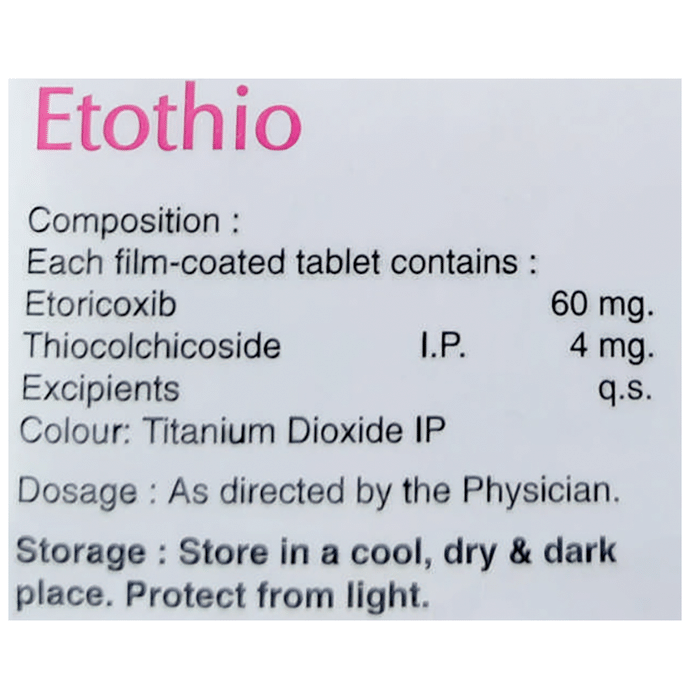 Etothio Tablet is a combination of two medicines: Etoricoxib and Thiocolchicoside, which relieves pain and relaxes the muscles. Etoricoxib is a non-steroidal anti-inflammatory drug (NSAID) which works by blocking the release of certain chemical messengers that cause pain and inflammation (redness and swelling). Thiocolchicoside is a muscle relaxant. It works on the centers in the brain and spinal cord to relieve muscle stiffness or spasm and to improve pain and movement of muscles.
