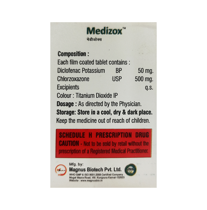 Medizox Tablet is a combination of two medicines: Diclofenac and Chlorzoxazone, which relieves pain and relaxes the muscles. Diclofenac is a non-steroidal anti-inflammatory drug (NSAID) which works by blocking the release of certain chemical messengers that cause pain and inflammation (redness and swelling). Chlorzoxazone is a muscle relaxant. It works on the centres in the brain and spinal cord to relieve muscle stiffness or spasm and to improve pain and movement of muscles.